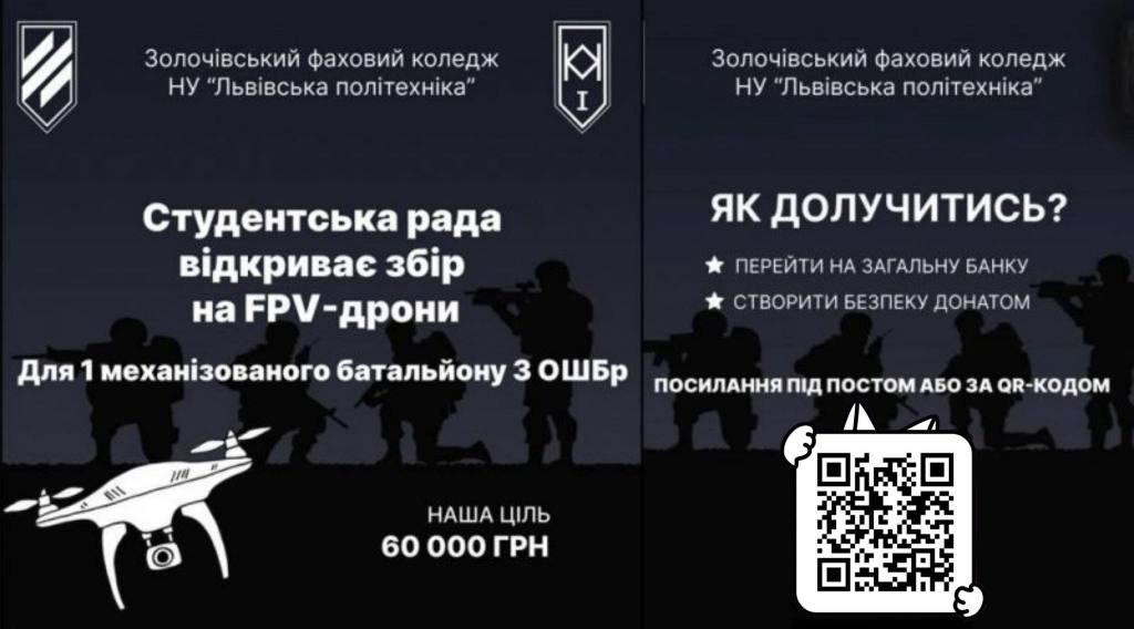Студентська рада Золочівського фахового коледжу відкриває збір на FPV-дрони для 1 механізованого батальйону З ОШБр